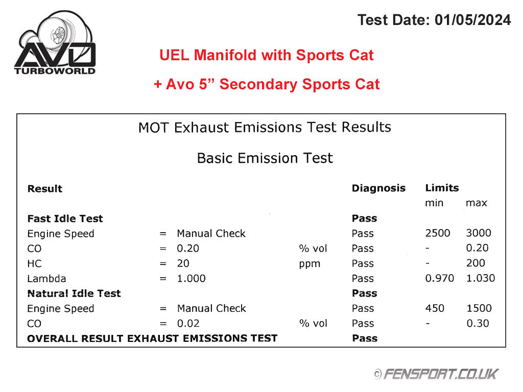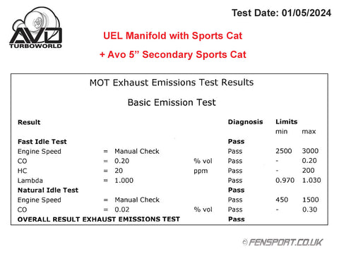 * We have emissions tested Avo UEL manifold with sports cat and it passes 2024 UK MOT with either standard 2nd cat or Avo 5" metal sports cat in place*