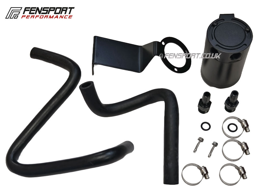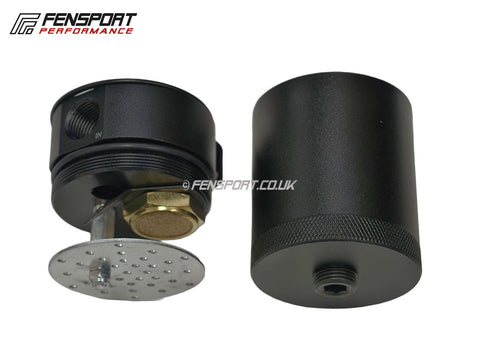 Single 2-Port Compact Baffled Oil Catch Can mounts in line with the PCV system to separate oil particles using 50 micron bronze filter