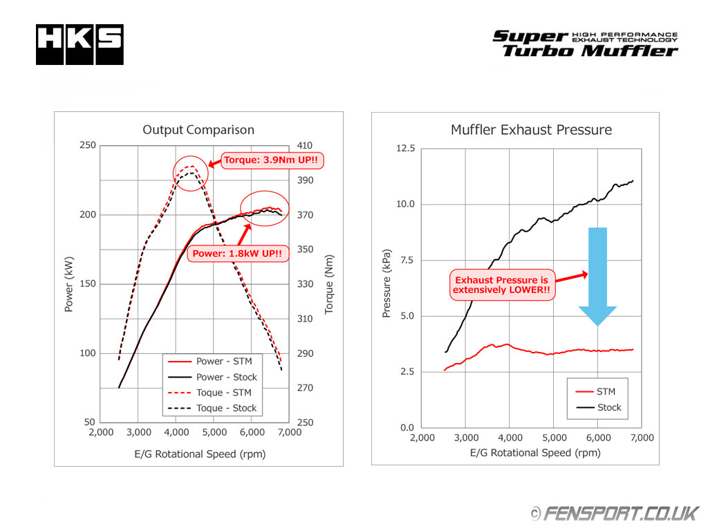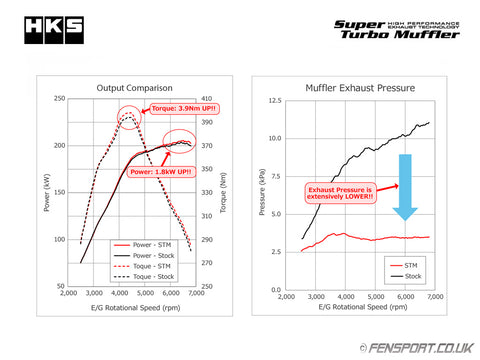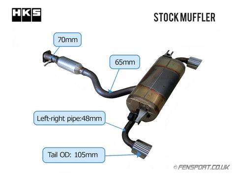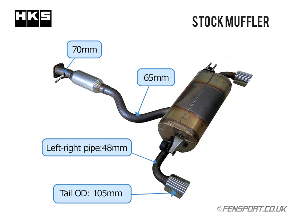 HKS Super Turbo Muffler exhaust is designed with a "straight structure" for low back pressure, low sound levels and maximum ground clearance.