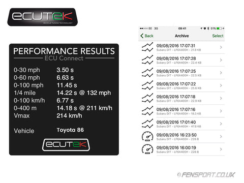A "snapshot" of the vehicle's performance can be recorded such as 0-60mph, quarter mile, Vmax and more. The info is saved as "Performance Results" and can be shared online instantly and can be saved for comparison.