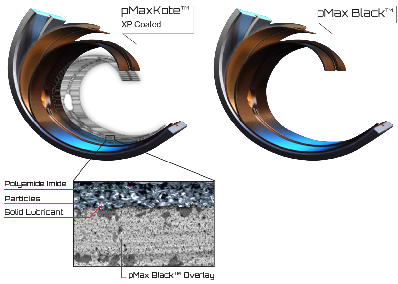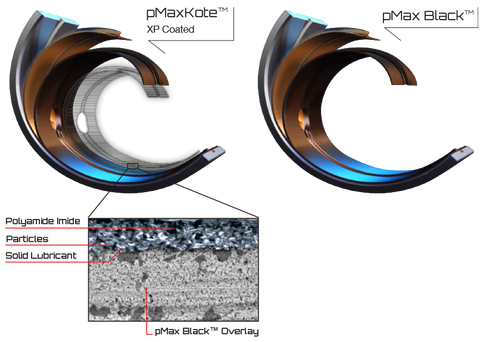 pMax Kote™ is a revolutionary new approach to coated bearings. This unique polymer coating is applied over King’s pMaxBlack overlay at the King factory during the bearing manufacturing process. King’s pMaxKote contains ceramic nano-composite particles that function as a fourth layer to enhance wear resistance. pMaxKote does not change the bearing’s original precision wall thickness and adds no additional thickness. It provides additional seizure resistance, superior cavitation resistance, improved wear resistance and protection against oil starvation.